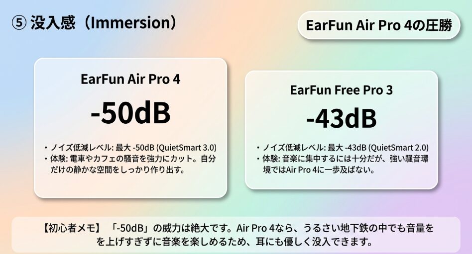 作業や音楽への没入感は、EarFun Air Pro 4の圧勝です。