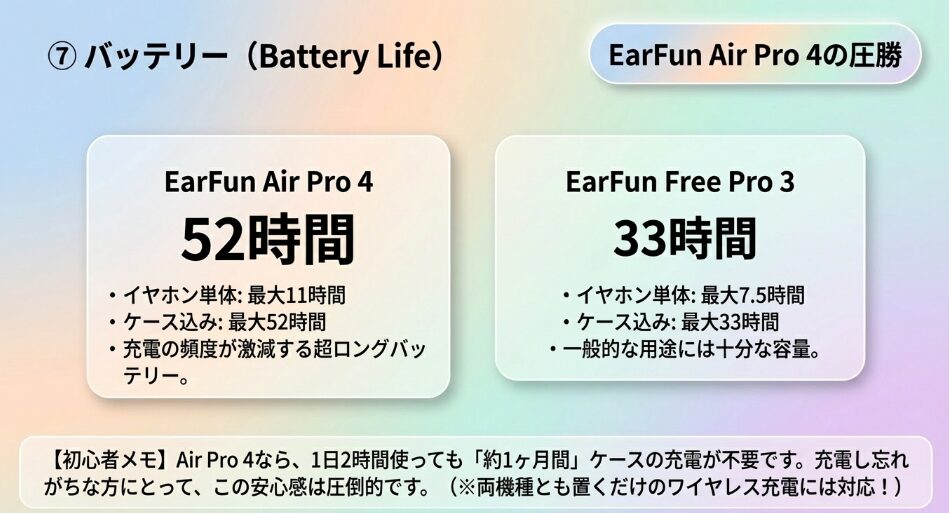 - バッテリー持ちは単体で最大11時間再生できるEarFun Air Pro 4が優秀