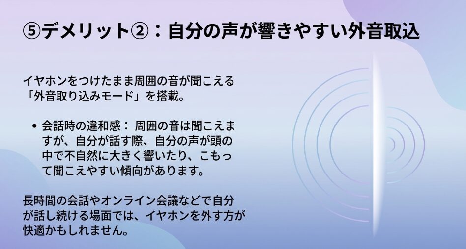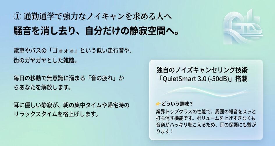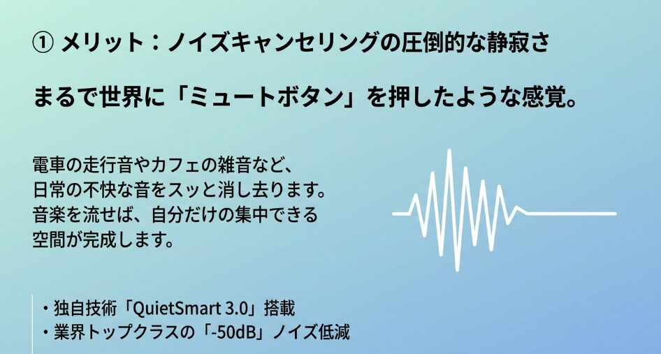 | 最適なシーン | 騒がしい通勤電車内やカフェ | 自分だけの空間で深く集中できる |