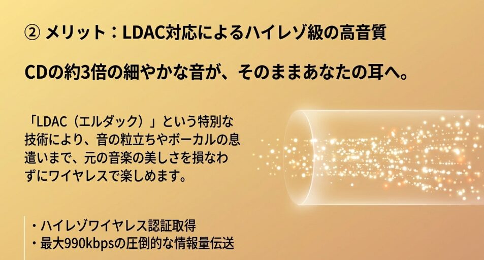 | 対応コーデック | LDAC・aptX Lossless対応 | ハイレゾ級の高解像度を楽しめる |