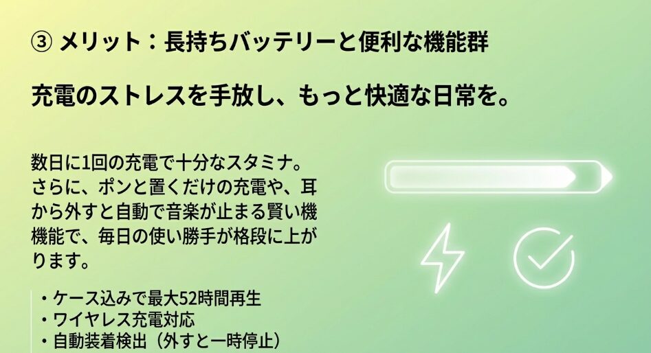 | 比較ポイント | EarFun Air Pro 4の強み | おすすめの理由 |