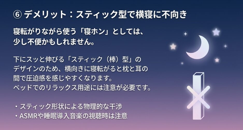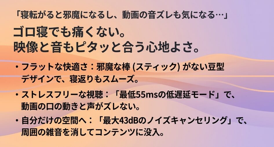 | 最適なシーン | 就寝前やリラックスタイム | 快適な寝ホンとして大活躍する |