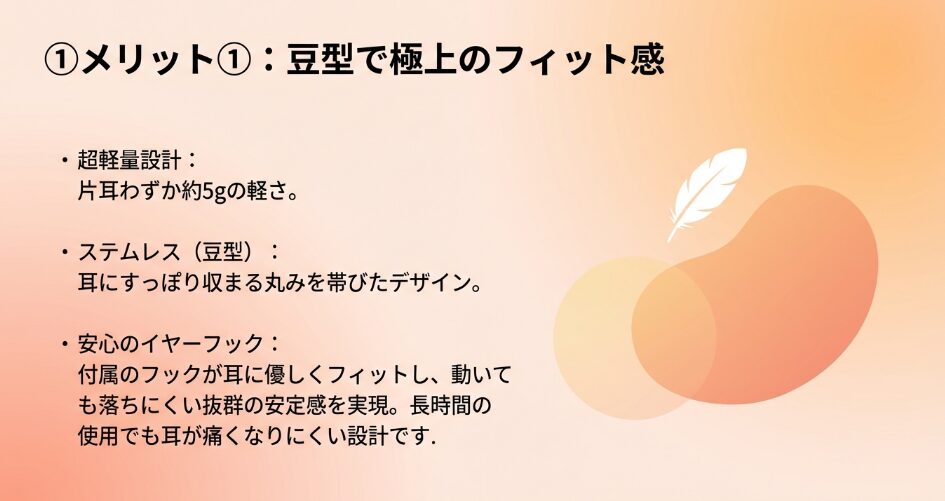 本体が非常に小さな豆型デザインを採用しており、耳の奥にすっぽりと収まります。