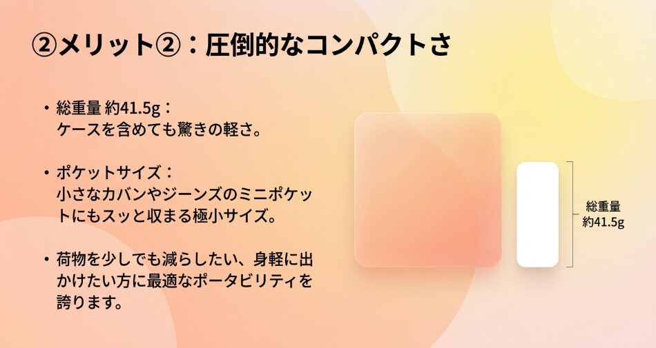 | ケースのサイズ | 圧倒的に小さくて軽量 | ポケットに入れてもかさばらない |