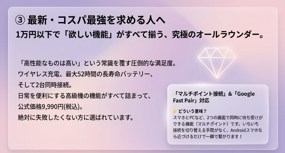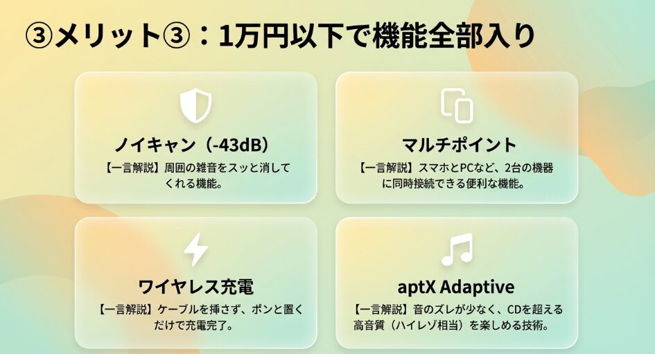 1万円以下の予算でハイエンド機並みの強力なノイズキャンセリングや高音質コーデックがすべて手に入るからです。