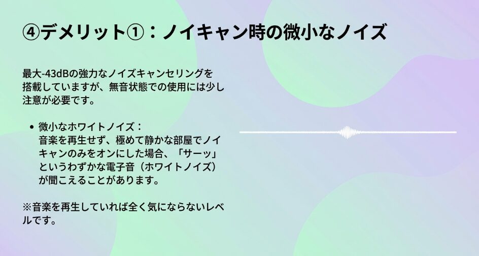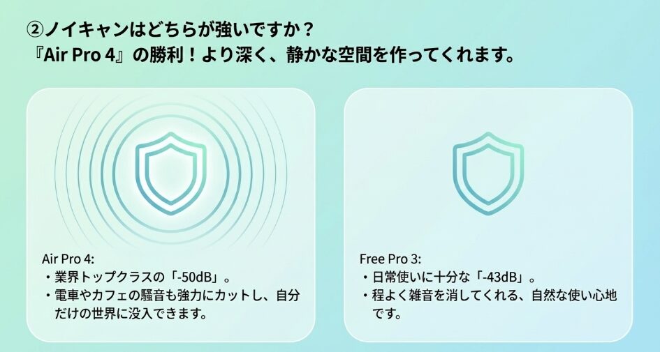 | ノイキャン性能 | 非常に強力(最大50dB) | 日常レベル(最大43dB) |