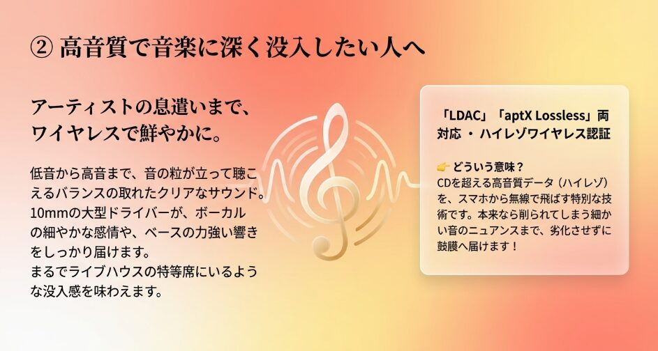 - LDACの高音質で音楽の細部まで楽しみたい人