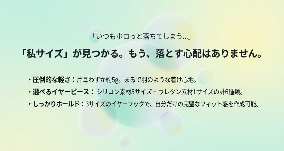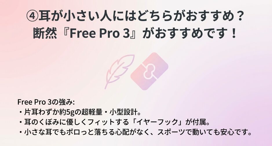 | 装着の安定感 | 激しく動いても落ちにくい | 小さな耳の人でも安心できる |