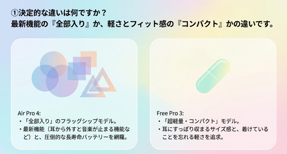このセクションでは、EarFun Air Pro 4とFree Pro 3の比較において、よくある疑問に端的な結論でお答えします。