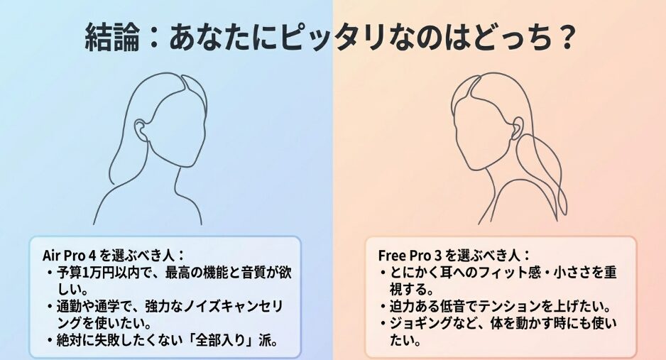 迷った際の最終的な答えとして、機能と没入感ならEarFun Air Pro 4、装着感の軽さならEarFun Free Pro 3を選ぶのが正解です。