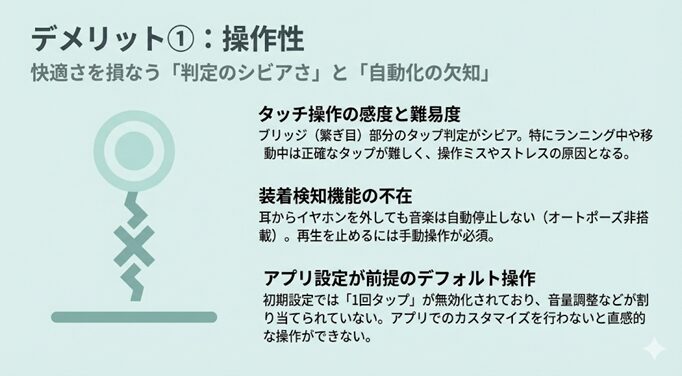 Anker Soundcore AeroClipのタッチパネルはスマートですが、イヤホンの位置を微調整する際に意図せず曲を止める等、誤操作に注意が必要です。