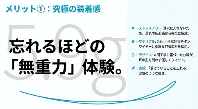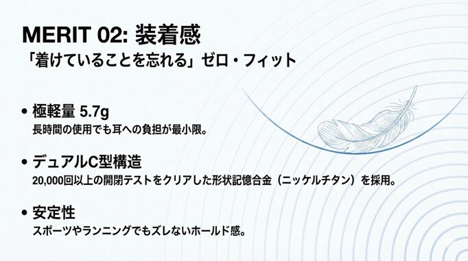- 「イヤホンを外した時の解放感」が不要になるほど、ずっと着けていられる