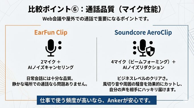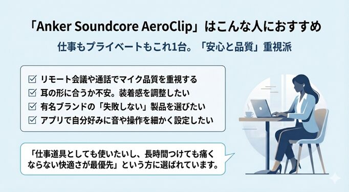 Anker Soundcore AeroClipのマイク性能とブランドの信頼性は、仕事でのWEB会議や大切な電話を頻繁に行うビジネスユーザーに欠かせない要素です。