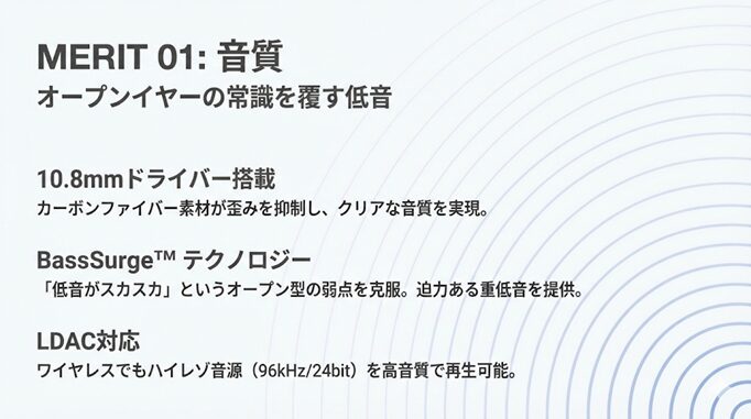 この大型ドライバーをベースに、LDACコーデックを使用してハイレゾ音源を聴いた際、オープンイヤー型と思えない低域の迫力をしっかりと再現します。