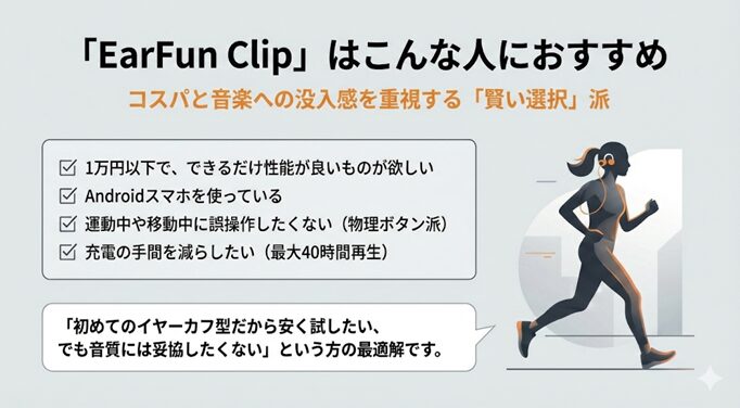 EarFun Clipがおすすめな人は、何よりもコストパフォーマンスを最優先し、手軽に「ながら聴き」を楽しみたい人です。