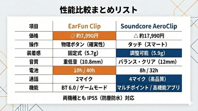 まとめ:EarFun ClipとAnker Soundcore AeroClipの比較