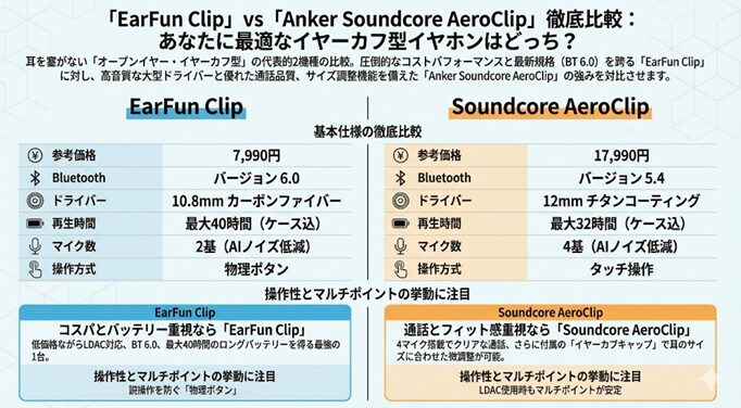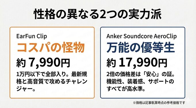 先に結論から言うと、コスパと確実な操作性を求めるなら「EarFun Clip」が、音質の深みと洗練されたデザインを求めるなら「Anker Soundcore AeroClip」が正解です。
