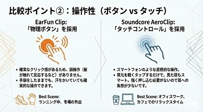 EarFun ClipとAnker Soundcore AeroClipの操作性には、物理ボタンとタッチパネルという決定的な違いがあります。