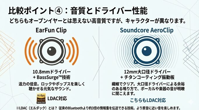 EarFun ClipとAnker Soundcore AeroClipは、どちらもLDAC対応で「ながら聴き」の質を一段階引き上げてくれますが、何を重視するかで選ぶべき機種は変わります。