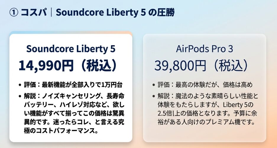 Soundcore Liberty 5とAirPods Pro 3の比較で最も際立つのは、14,990円と39,800円という圧倒的な価格差ですよね。