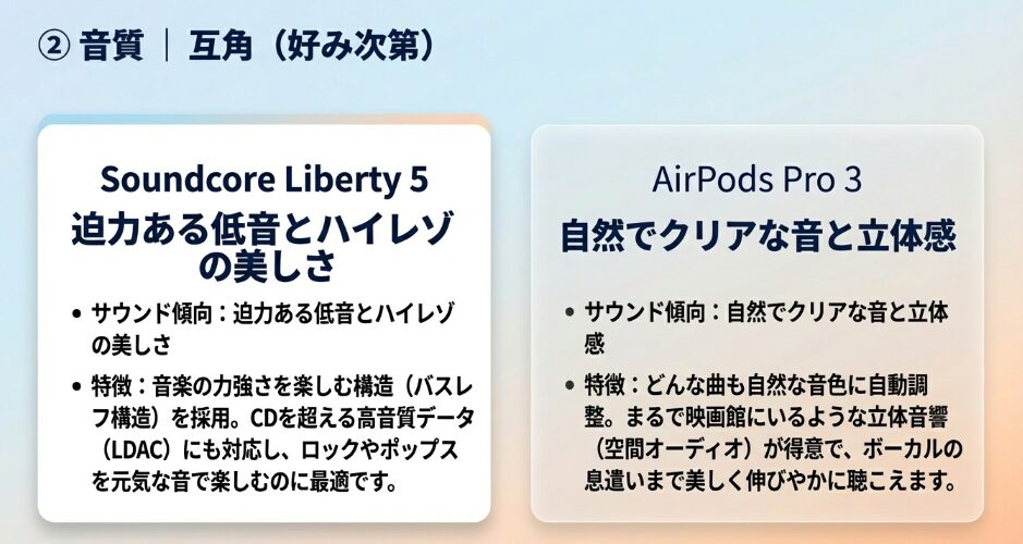 Soundcore Liberty 5とAirPods Pro 3の音質を比較すると、設計思想の違いによりユーザーの好みが分かれる結果となります。