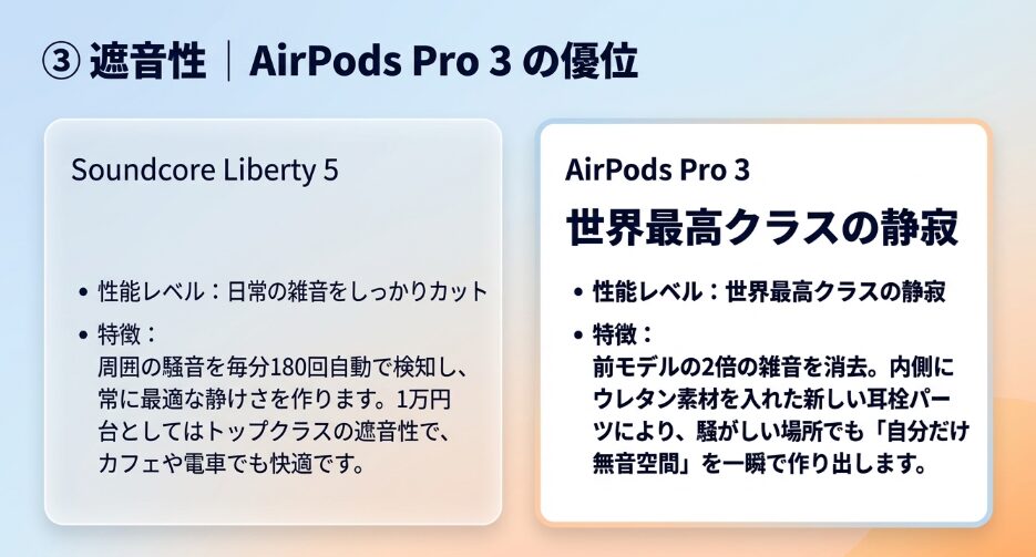 - 遮音性 | AirPods Pro 3の優位