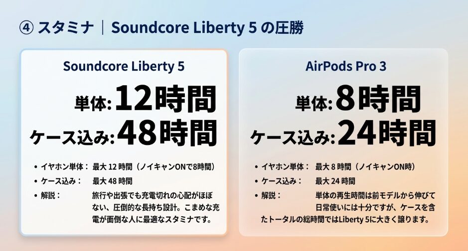 Soundcore Liberty 5とAirPods Pro 3の比較において、バッテリー持ちの長さはSoundcore Liberty 5が圧倒しています。