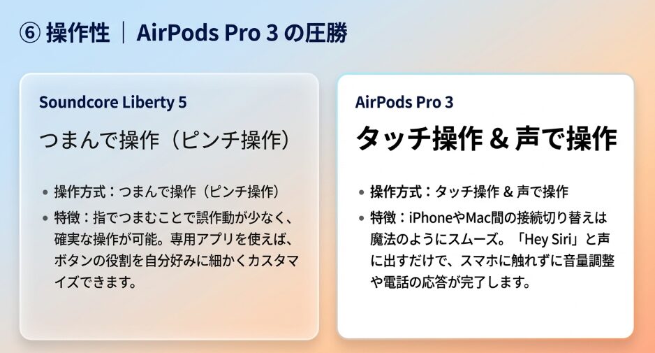 Soundcore Liberty 5とAirPods Pro 3の操作性を比較すると、直感的なインターフェースにおいてAirPods Pro 3がとても高い完成度を誇ります。