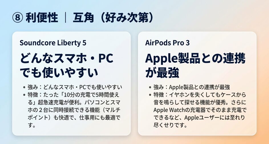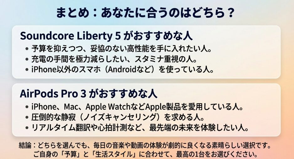 まとめ:Soundcore Liberty 5とAirPods Pro 3の比較