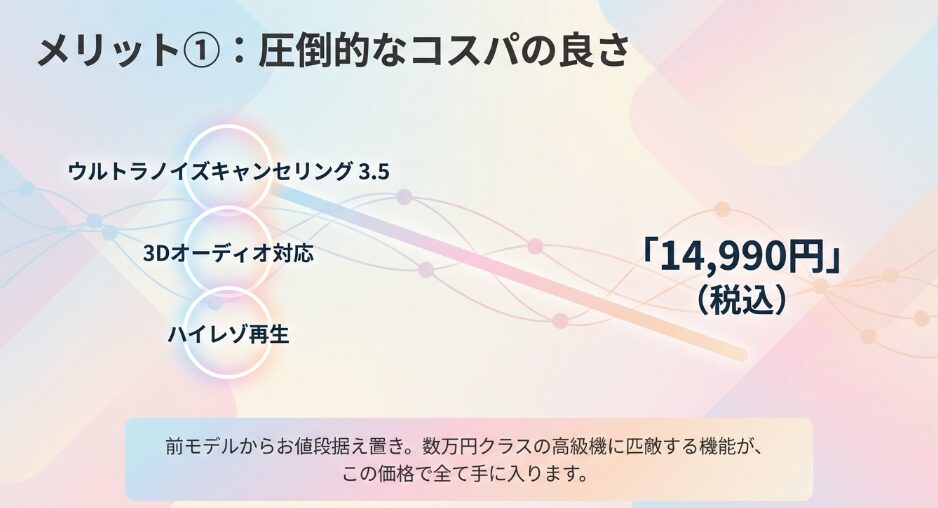 このモデルは「音楽を聴く」という本質的な機能において、AirPods Pro 3との価格差以上に十分な満足感を届けてくれます。