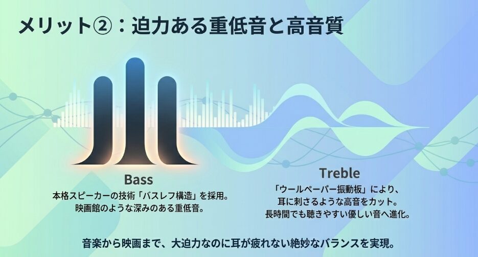 | 音響設計 | バスレフ構造採用 | 新しい計算音響学(H3チップ) |