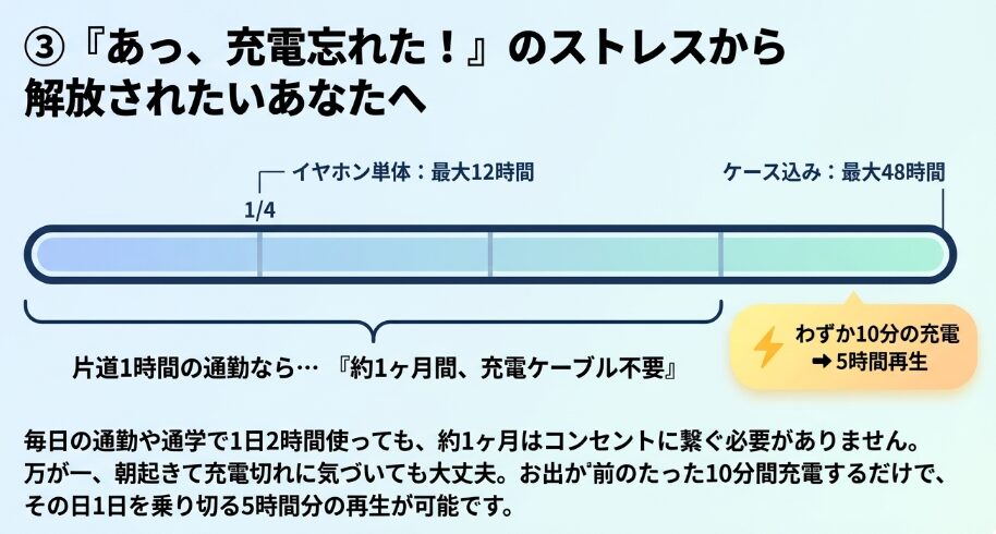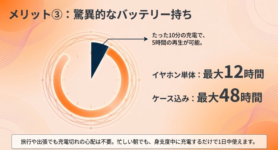 イヤホン単体で最大12時間の連続再生が可能で、ケースを含めると最大48時間という驚きの持続力を誇ります。