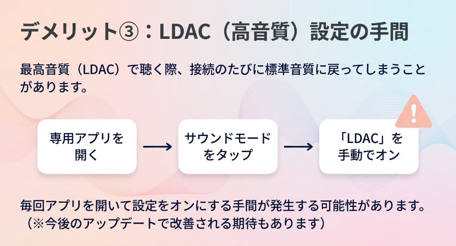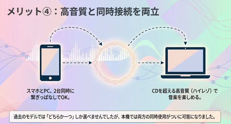 どちらかを我慢する必要がないので、PCでの会議とスマホでの音楽鑑賞を、綺麗な音のままスムーズに行き来できてとても便利です。