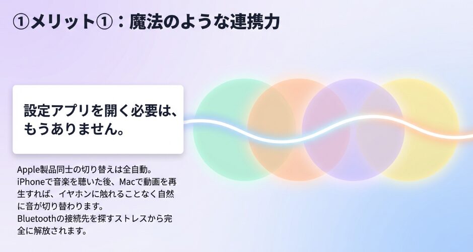 そして、Appleデバイス間を瞬時に切り替えるシームレスな操作性という、他社製品では代替不可能な連携体験を提供してくれます。