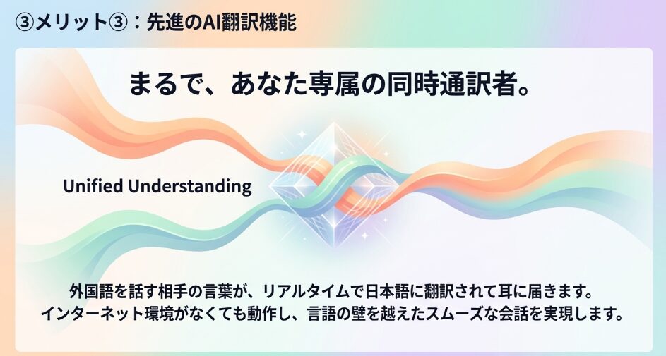 iPhoneと連携することで、対面での会話をリアルタイムで翻訳し、耳元で音声を流してくれる機能です。
