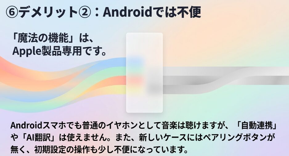 ライブ翻訳や健康データの連携、機器間の自動切り替えなどが制限されてしまう点には注意が必要です。
