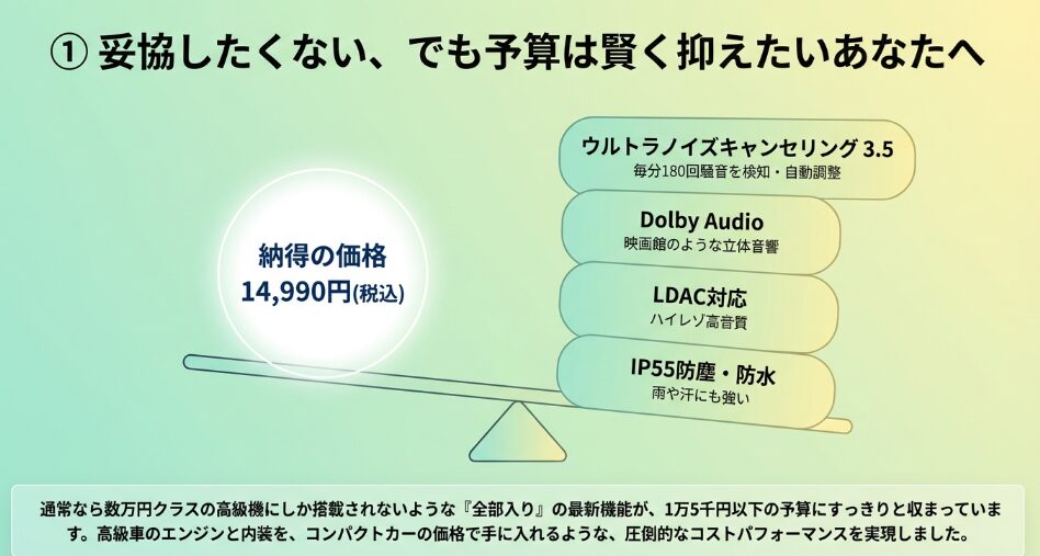 - 1.5万円の予算内で、4万円クラスに匹敵する強力なノイキャンを体感したい人