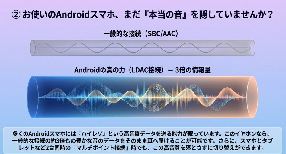 ハイレゾ級の解像度を誇るLDACにしっかり対応しており、機器の制限を受けることなく綺麗な音を楽しめるからです。