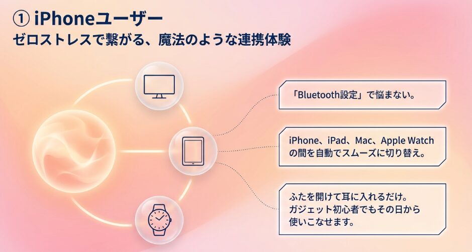 ペアリングの手間が一切なく、MacやiPadへの切り替えも自動で行われるため、接続設定のストレスを感じることはありません。