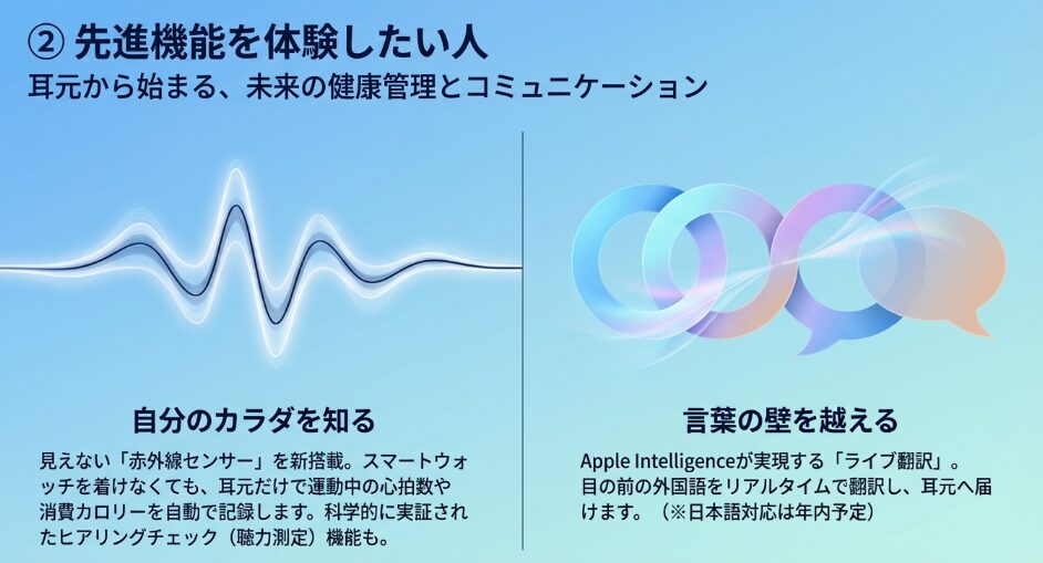 Apple Intelligenceによるライブ翻訳や心拍数センサーといった、イヤホンの枠を超えた次世代の体験を求める方にとって、毎日を豊かにしてくれる価値があります。