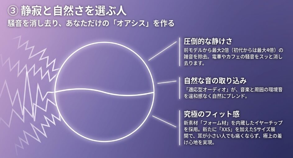 - 自然な外音取り込みや空間オーディオを大切にする方には、AirPods Pro 3が優しくフィットします。