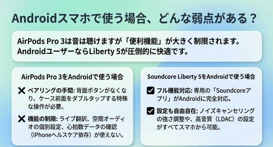 Android環境でイヤホンの性能をしっかり活かすなら、Soundcore Liberty 5を選ぶほうが安心感がありますね。