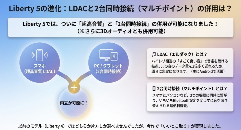 Soundcore Liberty 5は、高音質なLDAC接続と、2台の機器を同時につなげるマルチポイント機能の両方を使うことができます。