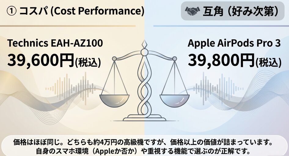 価格の面で比較すると、Technics EAH-AZ100とAirPods Pro 3はどちらも約4万円と、互角の勝負です。