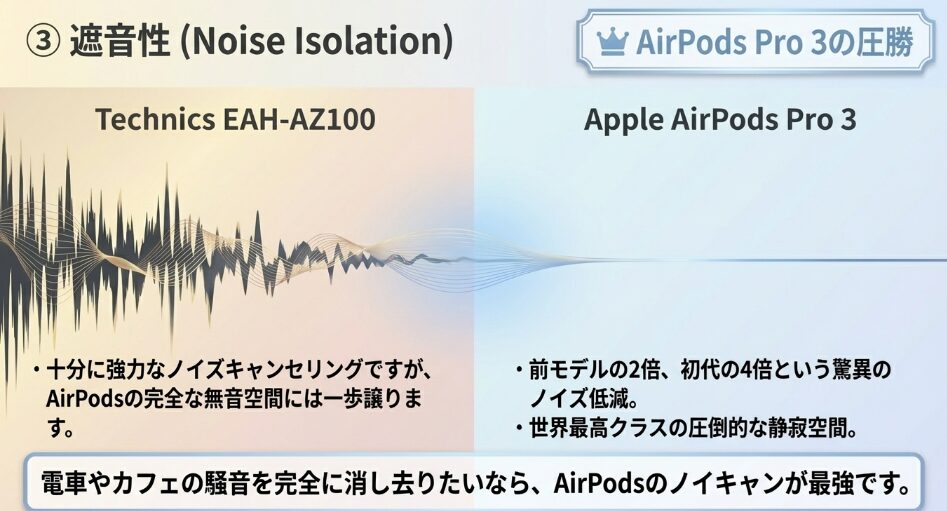 - 遮音性|AirPods Pro 3の圧勝