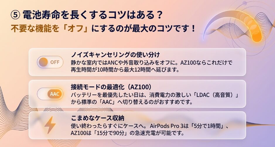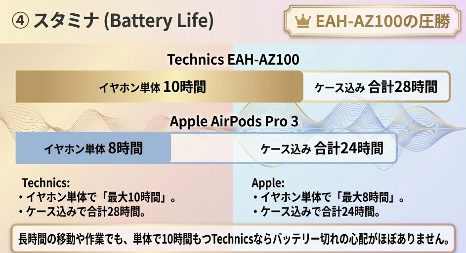 AirPods Pro 3も最大8時間と十分に進化していますが、さらに長く使いたい場面ではEAH-AZ100に軍配が上がりますね。