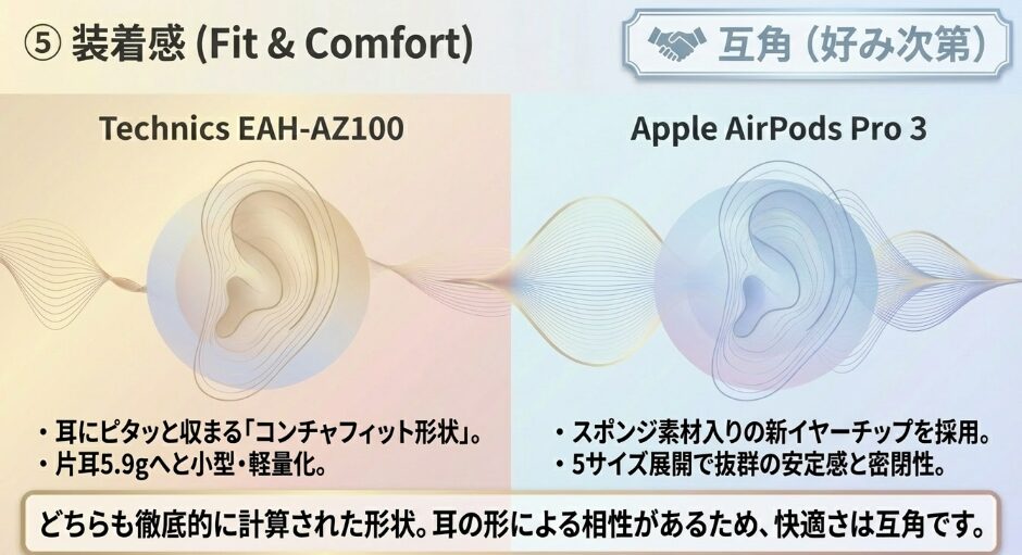 装着した時の心地よさについては、Technics EAH-AZ100とAirPods Pro 3で好みが分かれる部分です。