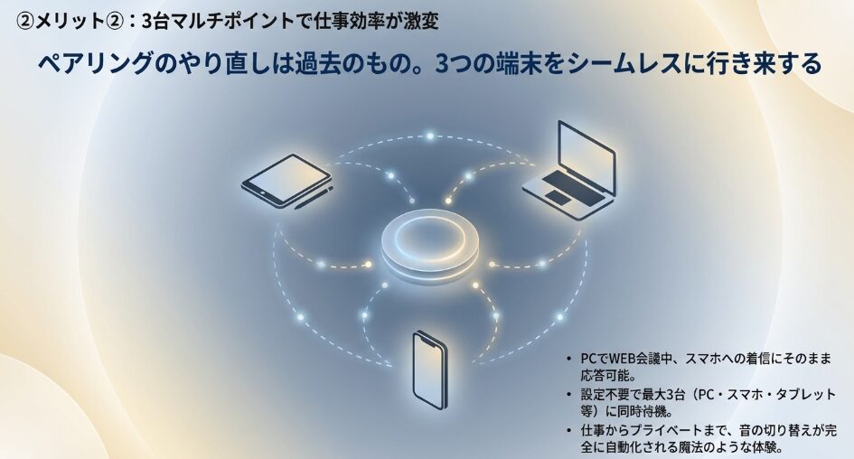 パソコンでのWeb会議、スマホでの着信、タブレットでの動画視聴を、接続し直す手間なく行き来できるのはとても快適です。