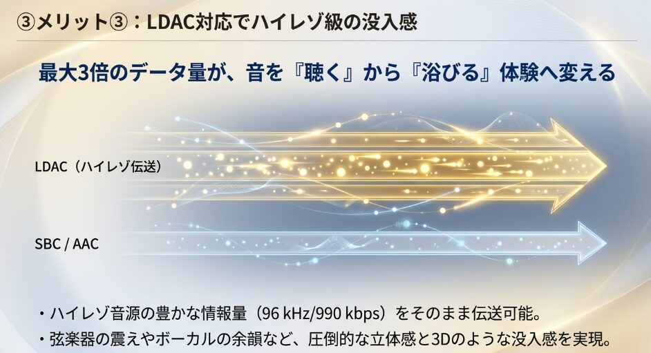| 高音質規格 | LDAC対応でハイレゾ級の伝送が可能 |
