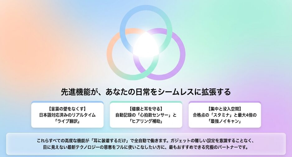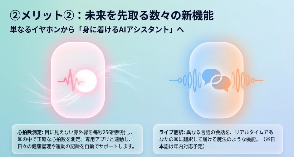 心拍数センサーやライブ翻訳など、生活をグッと豊かにする未来の機能がたくさん詰まっているからです。